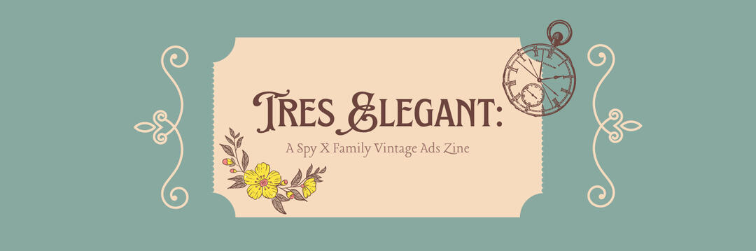 Tres Elegant is a for-profit Spy X Family fanzine inspired by vintage ads.Although the series doesn't have a specific time period, the context places it around the 1960s. We are aiming to create a zine with ads for food, fashion, or other products featuring beloved SxF characters in the style of European/American ads in the Art Deco style that was popular starting in the 20th century! Writing pieces will include product reviews/endorsements by characters, interviews, and more! Check out our style guide moodboard for examples of the aesthetic we are aiming for!Special thanks to Glazed Moon (a Vintage Ads themed Genshin Impact Zine) for inspiring us with this theme! Their preorders are already closed, but keep an eye out for their leftover sales!